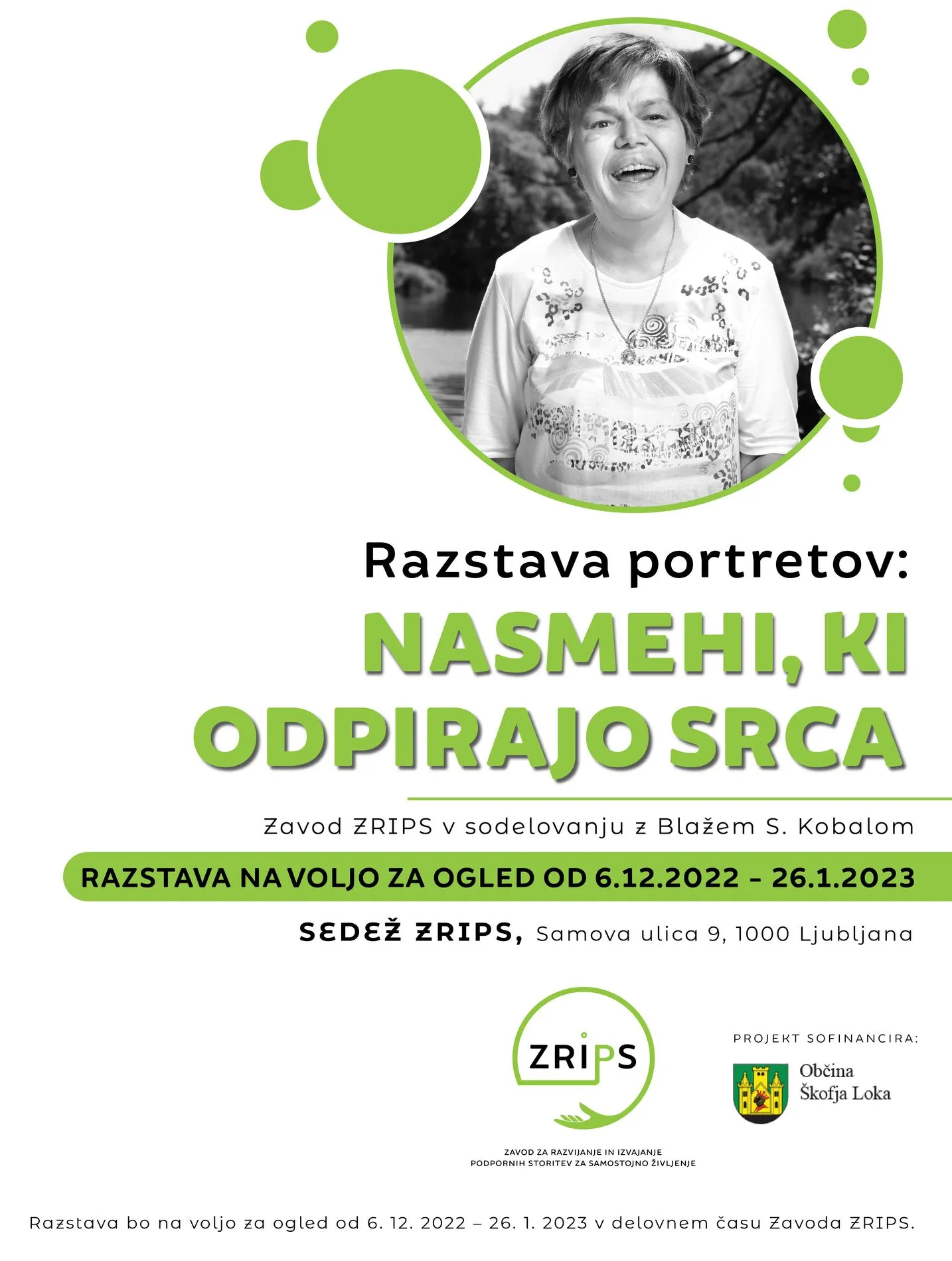 Zavod ZRIPS v sodelovanju z Blažem S. Kobalom predstavlja prostovoljni projekt, razstavo portretov oseb z motnjo v duševnem razvoju. V zavodu smo začutili, da je poleg osebne asistence, naše poslanstvo tudi destigmatizacija invalidov, še posebej oseb z motnjo v duševnem razvoju. Zavedamo se, da so invalidi, kljub ogromnim napredkom in pozitivnim rešitvam, ki so jim trenutno na voljo, še vedno velikokrat močno stigmatizirani. Namen te razstave je prav destigmatizacija. Ljudje, ki nimajo stika z invalidi, ne poznajo njihovega razmišljanja, prisrčnosti, iskrenosti. Ob njih se velikokrat počutijo neprijetno, jih gledajo postrani ali se obrnejo proč, včasih se jih celo bojijo. Verjamemo, da je vse to le za to, ker z njimi skoraj zagotovo nikoli niso imeli pravih, pristnih stikov. Šele takrat se namreč lahko z njimi povežeš, jih začutiš in sprejmeš. S to razstavo želimo, da ima širša množica ljudi možnost posrednega stika z njimi. Na ta način jim bomo omogočili boljše sprejemanje ob neposrednem srečanju z njimi. Prav čudoviti nasmehi pa so tisti, ki najlepše opišejo osebe z motnjo v duševnem razvoju. Iz njih veje pozitivnost, pristnost in iskrenost.